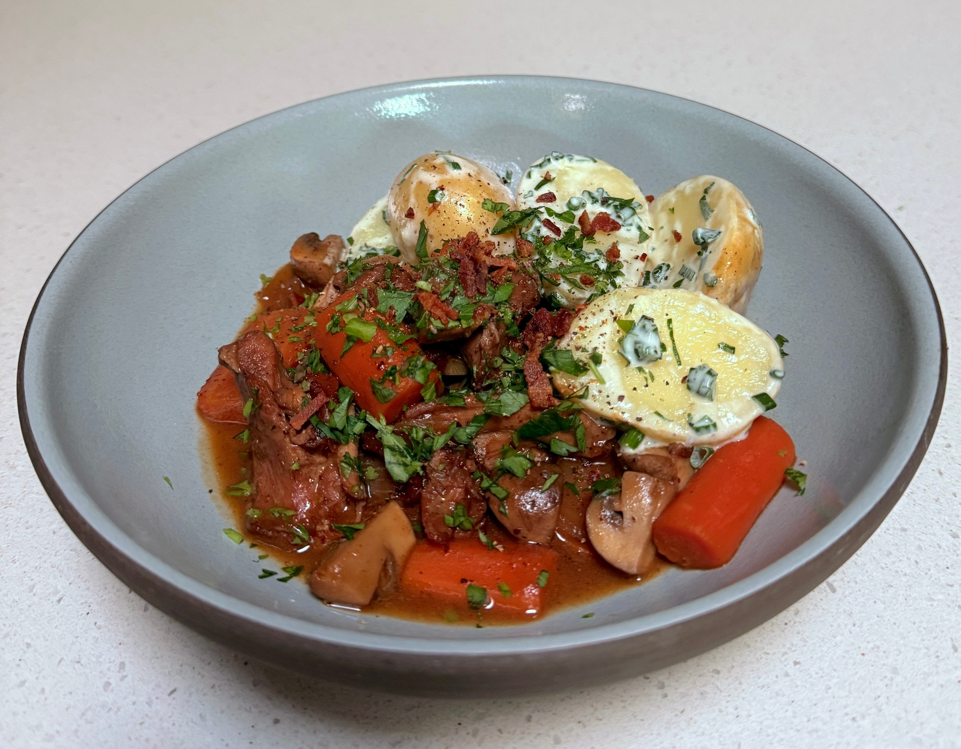 Serve your Coq au Vin in a shallow bowl along with your creme fraiche potatoes. Finish with crumbled bacon bits and a sprinkle of parsley.4